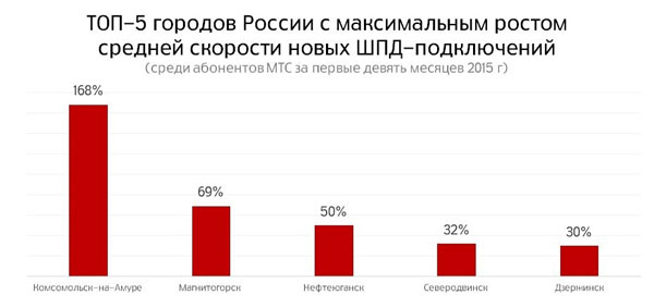 Самый высокий спрос на быстрый интернет оказался у абонентов МТС в городах Челябинской области, Хабаровском крае, Ханты-Мансийском АО, Архангельской, Нижегородской и Тюменской областях. Модернизация фиксированных сетей и запуск собственных магистральных линий позволили полностью удовлетворить величину спроса на «тяжелый» интернет-контент в этих регионах. В топ-5 городов с наибольшим ростом скорости домашнего интернета вошли Комсомольск-на-Амуре (Хабаровский край), Магнитогорск (Челябинская область), Нефтеюганск (Ханты-Мансийский АО), Северодвинск (Архангельская область) и Дзержинск (Нижегородская область), где средние скорости подключений проводного интернета для новых абонентов МТС за девять месяцев 2015 года выросли до 168%.