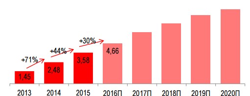 По данным iKS-Consulting, объем сегмента виртуальных АТС и других приложений для телефонии по итогам 2015 года стал вторым по размеру сегментом SaaS в нашей стране. Объем этого рынка в денежном эквиваленте составил 3,6 млрд рублей. В текущем году объем рынка составит 4,66 млрд рублей. Таким образом, прирост замедляется: в 2014 году он составлял 71%, в 2015 году – 44%, а в 2016 снизится до 30%. Прогноз развития сегмента виртуальных АТС и других приложений для телефонии в 2016–2020 гг., млрд руб.