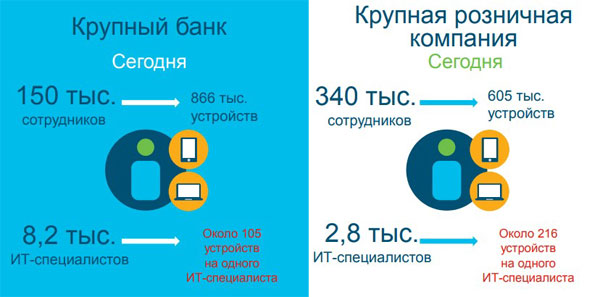 Андрей Кузьмич, директор по технологиям Cisco , заметил, что бизнесу становится все более удобно пользоваться технологиями, поэтому и их проникновение растет. При этом к сети предъявляется все больше требований. В компании уверены, что мы вплотную подошли к началу эра сетевых технологий, связанной с интенционно-ориентированными сетями, работающими на основе намерений. Уже сейчас в крупном банке приходится 866 тыс. подключенных устройств на 150 тыс. сотрудников, а в крупной розничной компании – 605 тыс. устройств на 340 тыс. сотрудников. При этом на одного IT-специалиста в банке приходится примерно 105 устройств, а в розничной компании – 216 устройств.