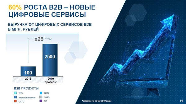Одно из важных для компании решений, которые должны привести к росту бизнеса, это выход в новые регионы не за счет покупки активов, а благодаря строительству собственной сети. В частности, в Архангельске будет построена сеть нового поколения. Что касается освоения других новых территорий, то в планах «ЭР-Телеком» – выход на московский рынок B2B, а также на B2B и B2C-рынки Подмосковья. Еще одна точка роста, по мнению Андрея Кузяева, - предоставление услуг в сельской местности. Речь не про коттеджные поселки, а про небольшие населенные пункты, куда оператор приходит за счет программы «Устранение цифрового неравенства». Логика проста: если в таких населенных пунктах у жителей есть деньги на оплату услуг спутникового ТВ-оператора, то за услуги доступа в интернет и цифрового ТВ от «ЭР-Телеком» они точно смогут заплатить. Поддержать такую экспансию должно развитие сети. К 2021 году, как обещает Андрей Кузяев, 50 % сети сможет обеспечивать гигабитные подключения, а в 2022 году уже от 70 до 80 % сетей будут предоставлять 1 Гбит/с на домохозяйство. В планах – перейти на 10 Гбит/c, причем уже к 2023 году, как отметил Кирилл Пищальников, директор по инфраструктуре компании. Инвестиции на развитие сети за три года составят 10 млрд рублей. К 2020 году оператор хочет создать собственную трансконтинентальную магистральную сеть – правда, решение об этом было принято очень давно – еще в 2015 году. «На сегодняшний день мы находимся на границе Монголии в районе Улан-Удэ, у нас есть собственное кольцо через Казахстан, Китай, Гонконг, Пекин и на Монголию, собственная сеть через всю страну, через Стокгольм, Франкфурт и через Беларусь в Москву. Мы подключены ко всем ключевым хабам», - рассказал Андрей Кузяев. И все же главное, на чем намерен зарабатывать оператор, это инновации: их доля в динамике выручки до 2024 года должна составить 50 %. Компания намерена создать digital-телеком-платформу Telco 2.0. Через три года планируется создать программно-определяемую сеть. Управлять сетью будет искусственный интеллект. Отдельного внимания заслуживают цифровые проекты компании, ориентированные на бизнес-рынок. Среди наиболее перспективных, с точки зрения самого оператора, направлений –решения в области искусственного интеллекта, видеоаналитики и интернета вещей. Эти решения в основном находятся в стадии пилотирования, но, как утверждают представители оператора, уже доказали свою эффективность. Среди подобных проектов – умные пешеходные переходы, каска с датчиками, мониторящая не только местоположение сотрудника, но и возможность падения, проекты «Умный свет» и «Умный домофон», решения для экомониторинга, отслеживания скоропортящихся товаров, видеоаналитики для ретейла и т.д. К примеру, использование тепловых карт в ретейле на 10 % увеличивает продажи низколиквидных товаров и в три раза снижают очереди – об этом свидетельствует опыт одного из клиентов «ЭР-Телеком». Уже в 2019 году выручка от цифровых B2B-сервисов оператора составит 2,5 млрд рублей, что в 25 раз больше, чем по итогам 2015 года. Если тогда компания предоставляла 2 цифровых сервиса для бизнеса, то к концу 2019 года – 24.